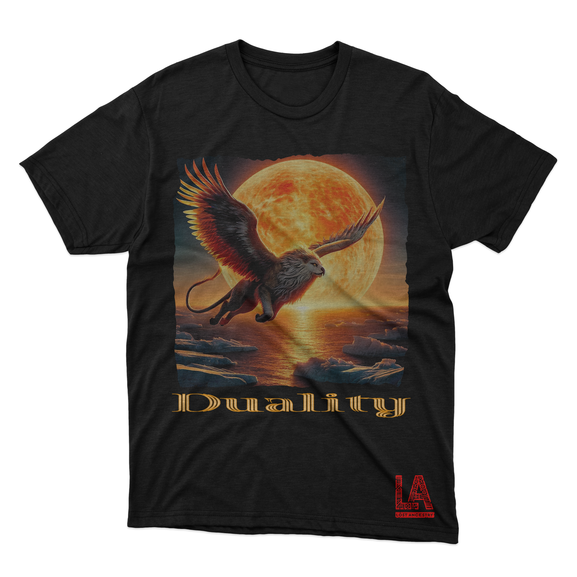 This shirt depicts the Griffin. In medieval European heraldry, the griffin became a popular emblem. Symbolizing Duality, divine power and strong guardian. The Griffin was often used on coats of arms and shields.