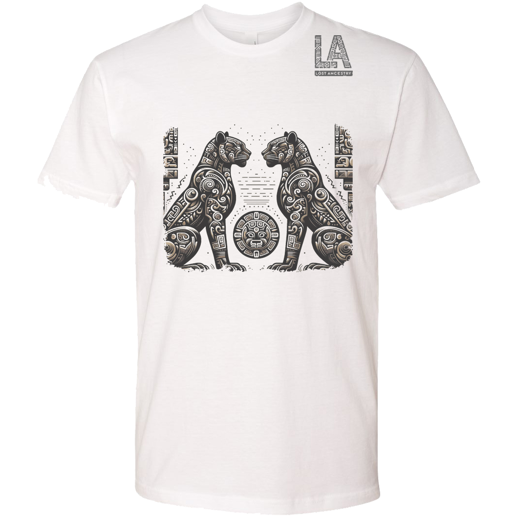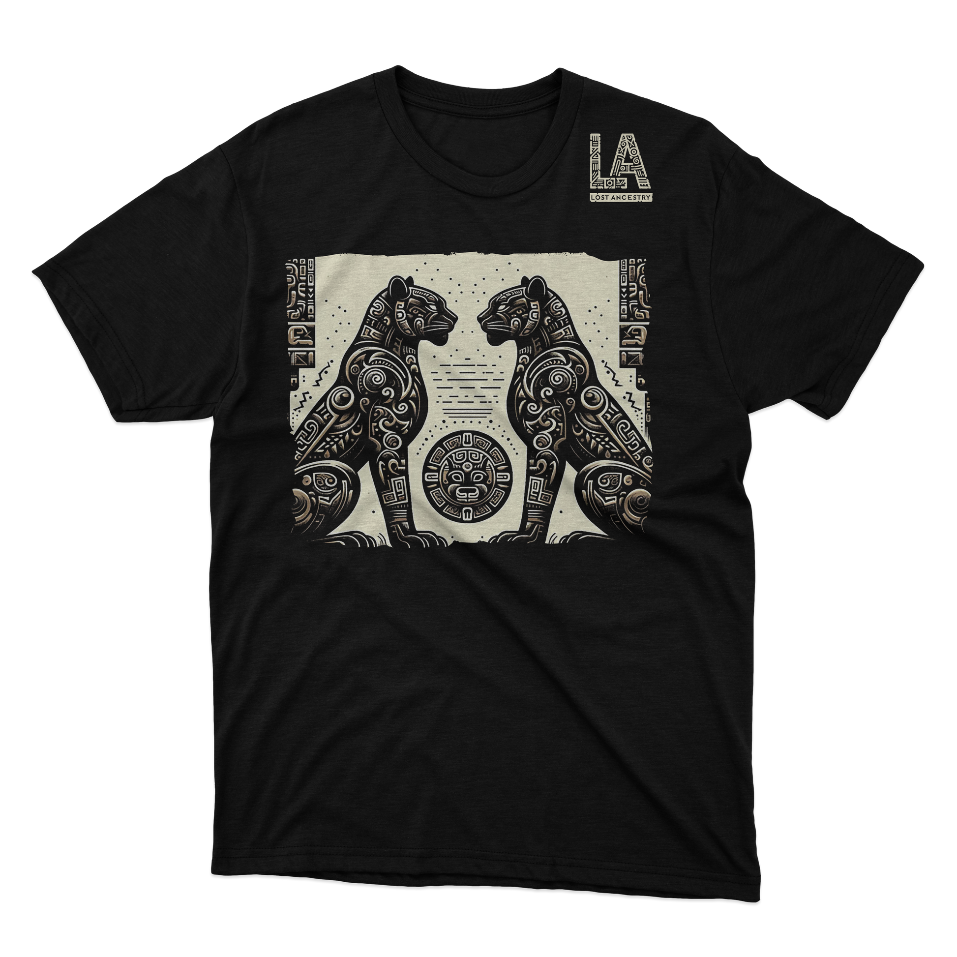 This graphic T-shirt shows The jaguar being reflected in Mayan pyramid art, where jaguars are carved into temple facades, staircases, and sacred altars. These artistic depictions are not merely ornamental—they are portals of power, invoking the jaguar’s strength and spiritual authority. The pyramids themselves, aligned with celestial patterns, were considered gateways between worlds, and the jaguar served as a sentinel between the earthly plane and the divine. Through this sacred architecture and imagery, the Mayans honored the jaguar as a fierce protector, a guide through the underworld, and a symbol of the eternal cycle of life, death, and rebirth.