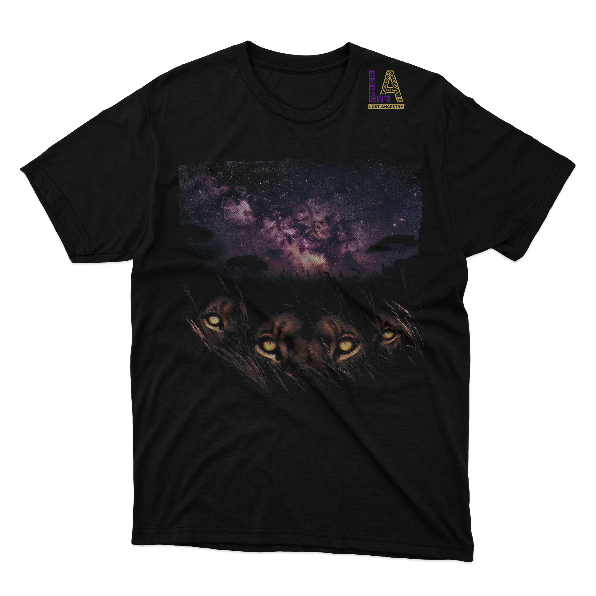 This graphic T-shirt depicts A lion's nighttime prowess. A lion's dominance in the animal kingdom contributes to their symbolic role in many cultures as guardians. The night, often associated with mystery and danger, becomes the lion’s realm—a place where their raw instinct and fearlessness reign supreme. embodying stealth, strength, and primal intelligence.